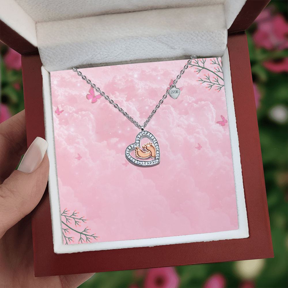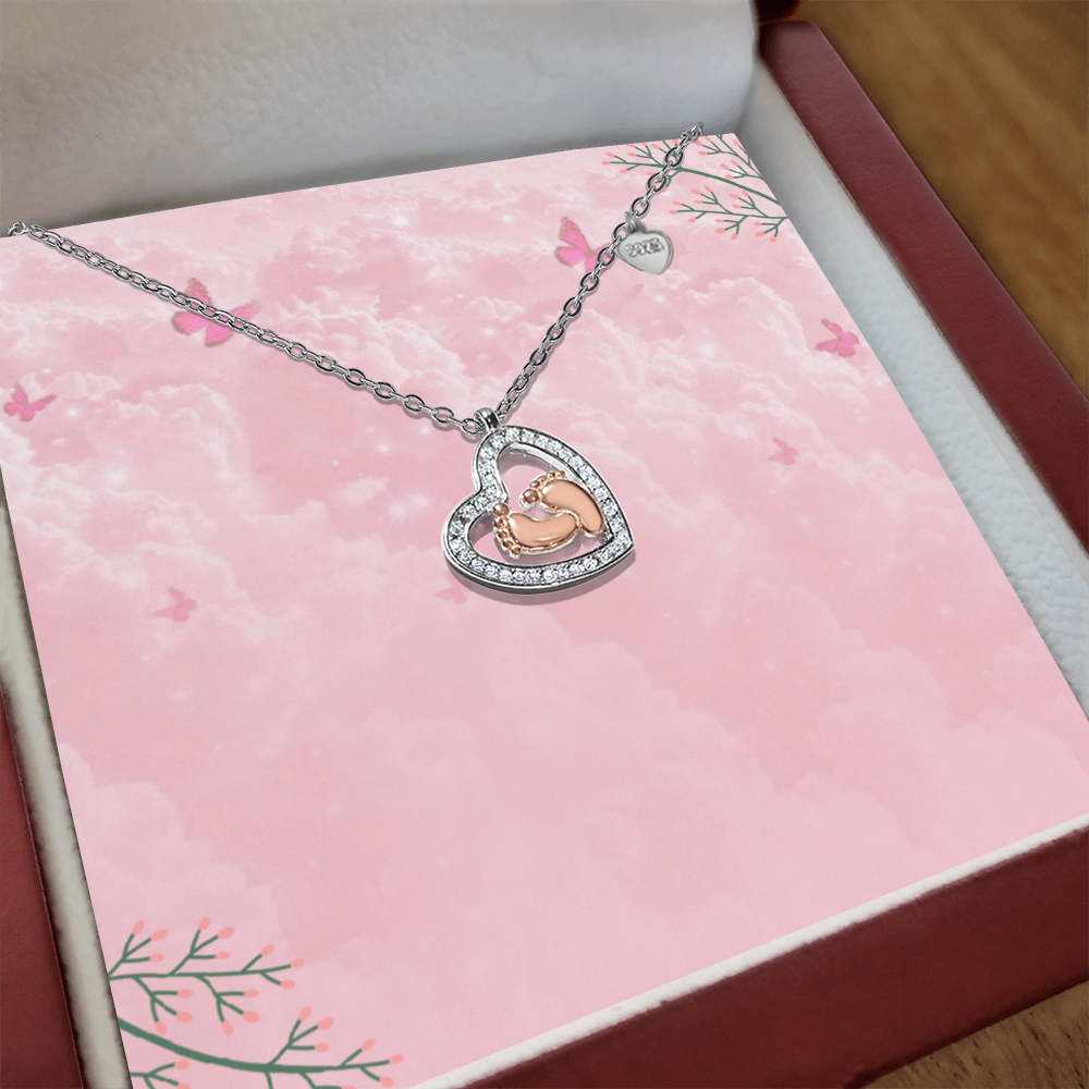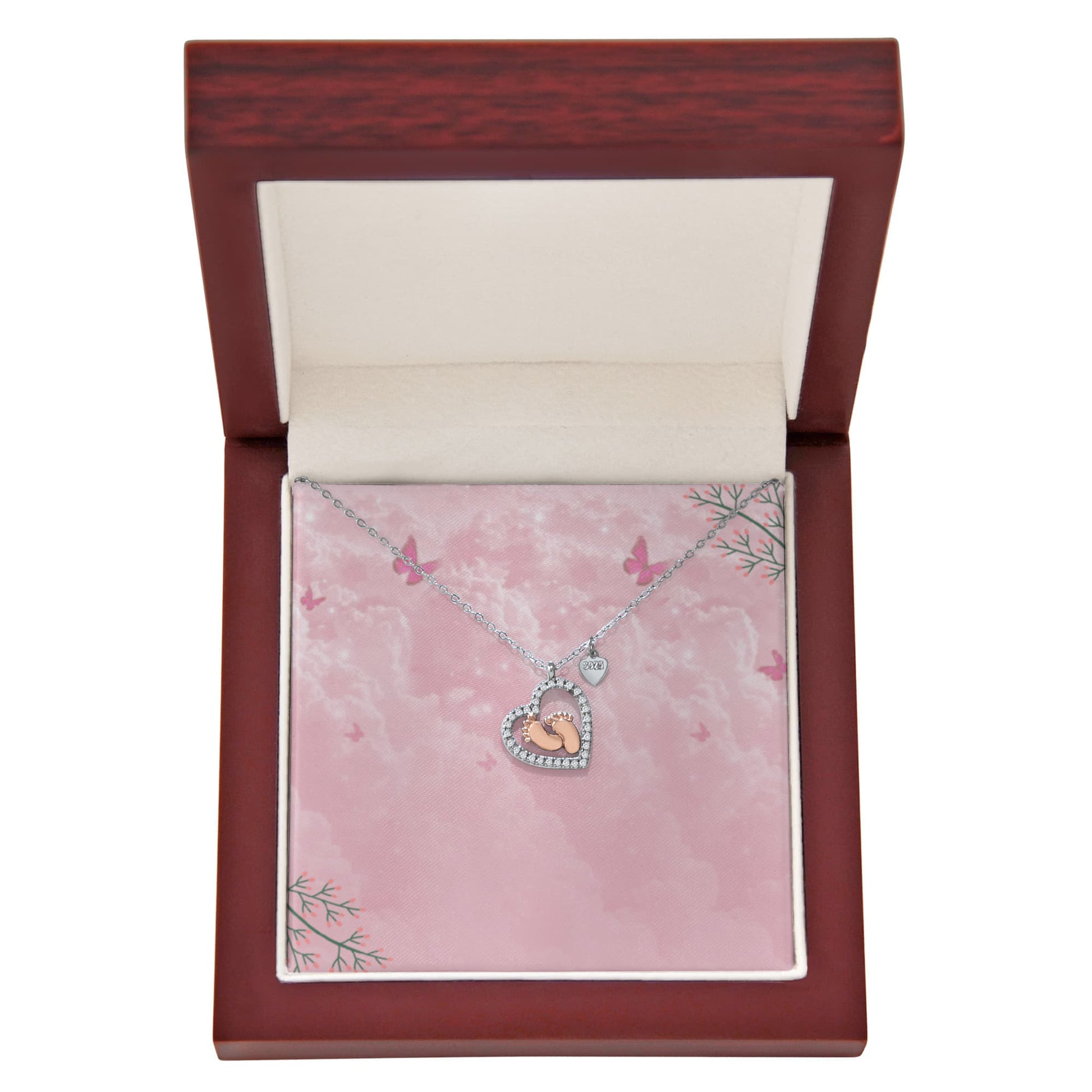 Stellen Sie sich ihre Reaktion vor, wenn sie dieses herzliche Symbol der Liebe, Familie und kostbaren Anfänge erhält. Die Baby Feet Heart Necklace verfügt über einen funkelnden, herzförmigen Rahmen, der mit schimmernden Zirkonia-Steinen besetzt ist und ein zartes Paar roségoldener Babyfüße umgibt. Eine berührende Hommage an die Mutterschaft und neues Leben – diese Halskette ist die perfekte Möglichkeit, eine frischgebackene Mutter, ein geliebtes Kind oder eine wachsende Familie zu feiern.