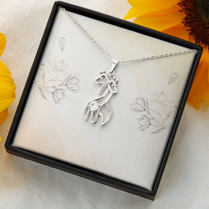 Giraffen sind bekannt für ihre Einzigartigkeit, Anmut und Stärke. Zeigen Sie Ihrem besonderen Menschen, dass er diese bemerkenswerten Eigenschaften teilt, mit einer bedeutungsvollen Geste der Liebe. Diese charmante Giraffen-Halskette, verziert mit funkelnden Zirkonia und gefertigt aus 14-karätigem Weißgold, ist das perfekte Geschenk, bestimmt, ein geschätztes Symbol Ihrer Zuneigung zu werden.