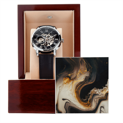 Verschenke ein Luxus-Präsent mit diesem schönen und gewagten Zeitmesser. Die Männer Skelettarmbanduhr ist die perfekte Mischung aus klassischem Design und modernem Styling, welches sie zu einem essenziellen Accessoire für deinen bemerkenswerten Stil machen. Die Armbanduhr stellt ein echtes Lederarmband zur Schau, ist kratzfest und ist mit ihrem gehärteten Mineralglas gefertigt, um langlebig zu sein. Unser einzigartiges Skelett-Ziffernblatt ermöglicht es uns auch, direkt in das Innenleben deiner Armbanduhr zu spähen. Sie wurde bedacht als Automatikuhr gefertigt, sie läuft allein durch Bewegung und benötigt keine Batterien. Du wirst die genaue Zeit immer bei dir haben, einfach, indem du sie trägst und es ist kein Aufziehen der Uhr notwendig. Dieses herrliche Stück ist das perfekte Geschenk für dich selbst oder jeglichen Mann in deinem Leben, der nach einer geschmackvollen Ergänzung seiner Garderobe sucht.