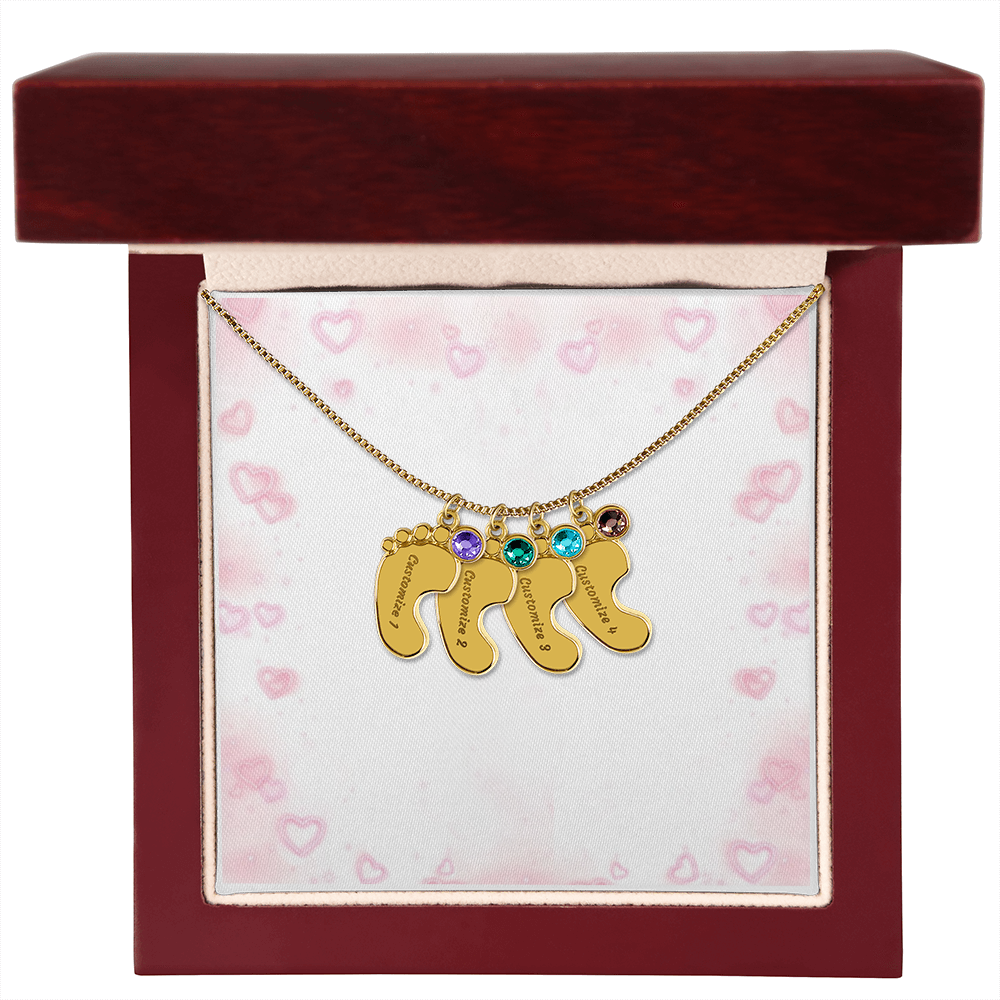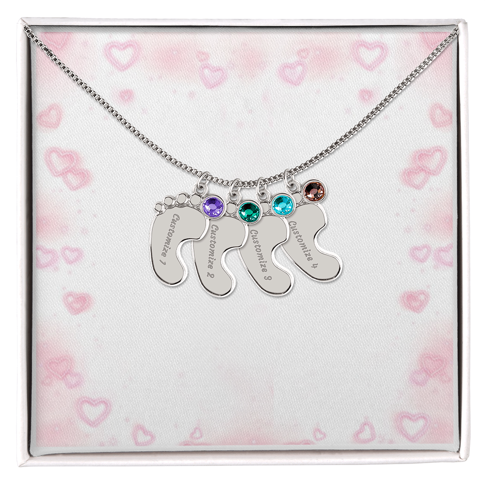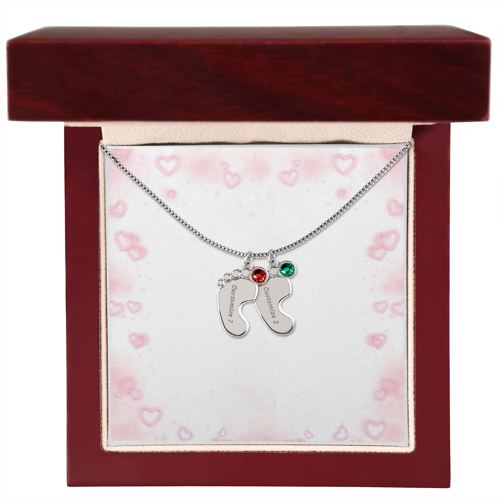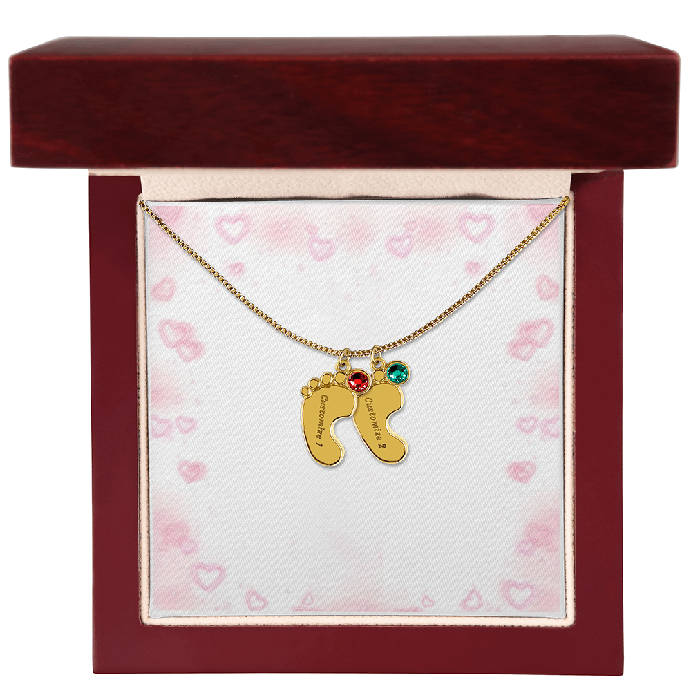 Feiere die Ankunft eines Neugeborenen oder schätze eine kostbare Erinnerung mit unserer Custom Baby Feet Necklace with Birthstone. Personalisiere dein Geschenk, indem du einen Namen deiner Wahl in den Anhänger eingravieren lässt und einen Kristall wählst, der mit dem Geburtsmonat des Babys korreliert. Und durch die Auswahl mehrerer Anhänger ist dieses individuelle Geschenk perfekt für Mütter und Großmütter mit großen Familien. Dies ist ein einzigartiges Andenken, das ein Leben lang geschätzt wird!