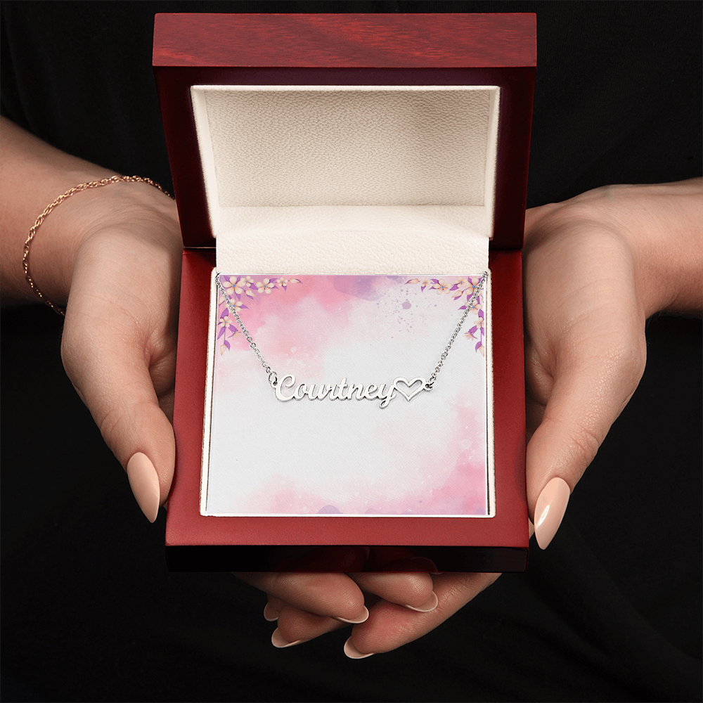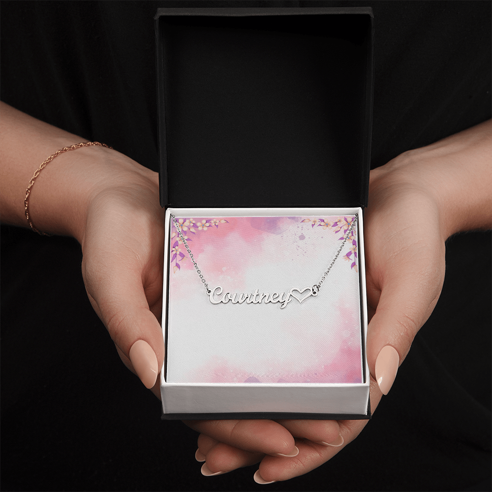 Dieser stilvolle Halskette verfügt über ein Namensdesign in Schreibschrift und ein Herzsymbol, das an einer verstellbaren Kabelkette von 16"-18" aufgehängt ist, was es sowohl persönlich als auch schön macht! Ihre Halskette wird auf Bestellung mit dem Namen oder Wort Ihrer Wahl, mit bis zu 10 Zeichen, individuell angefertigt. Es ist ein Geschenk, das sie sicherlich für immer nah am Herzen halten möchten!